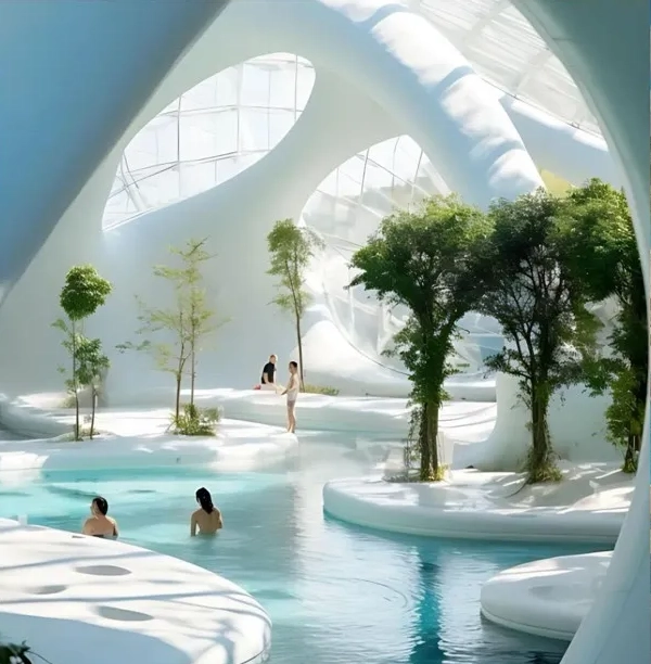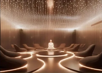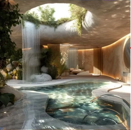 A futuristic underground space featuring a labyrinth and Himalayan salt caves.